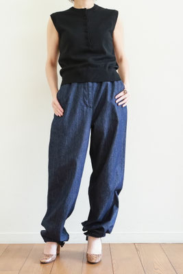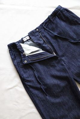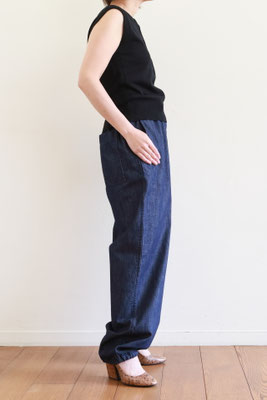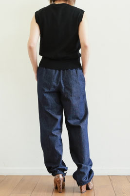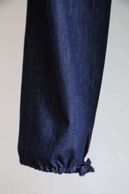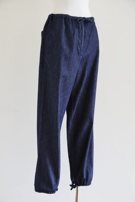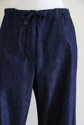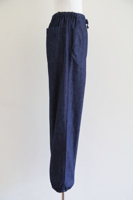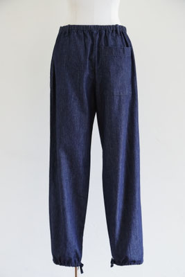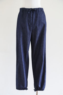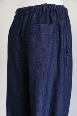 【 商品の特徴 】 ライトウェイト・デニム生地でつくられたパンツです。ウエストはゴム入りでフロントフライはジッパー。前ボタンのくるみボタンはダミーでスナップ式です。右側につけられたヒップポケットは浮かび上がるデザイン、スソにはドローストリングでリラックス感のあるデザイン。LOOK5 のパンツの生地違いのデニム版になります。薄手でふわっとしたシルエットですので、夏のデニムパンツとしてもおススメです。