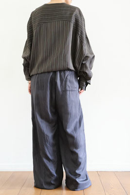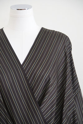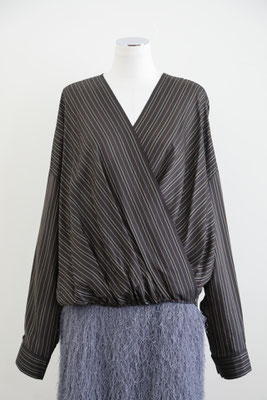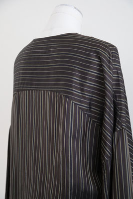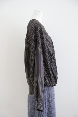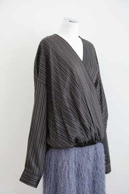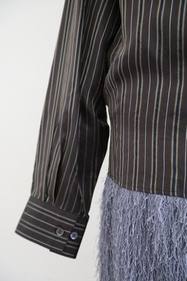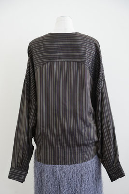【 商品の特徴 】ブラウンをベースに、スーツの裏地に使われるようなキュプラにゴールドとブルーのトラディショナルなストライプ柄をプリントした生地のシャツブラウスです。カシュクールのような打ち合わせのデザインで、前側はゴムが入れられて後ろ側は少しシェイプされています。背中側はカーブを描くような生地の切り替えがあり、肩部分は横方向に、背中部分は縦にストライプが入ります。とろっとしたキュプラ生地で、秋の立ち上がりにはブラトップなどをインして、冬にはタートルネックをインして、ご着用いただけます。LOOK14 のシャツブラウスになります。
