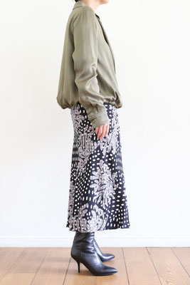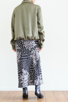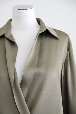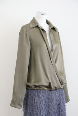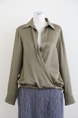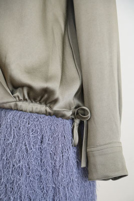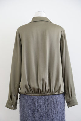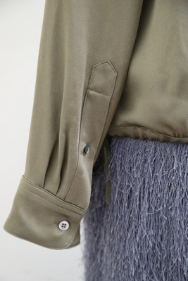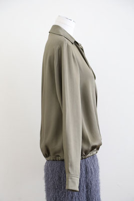 【 商品の特徴 】昨年秋からご好評をいただいているシャツブラウス「CEDAL」。この秋冬は、とろっとした柔らかなクレープサテン生地で入荷致しました。カシュクール風で、スソにドローストリングがインされていますので、キュッと絞ってウエストをマークしても、のばしてゆったりとしても、どちらでも様になるデザインです。このブラウスの色名はカーキ、薄くて光沢感があるセージグリーンです。