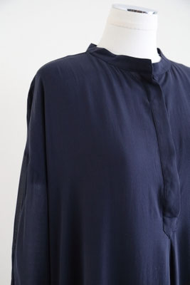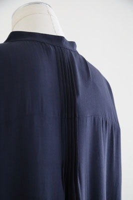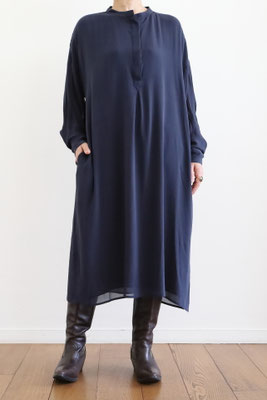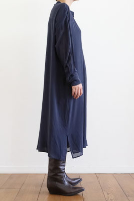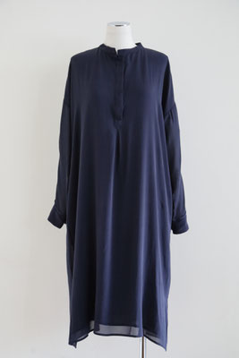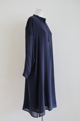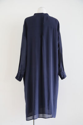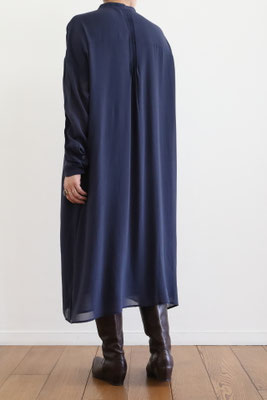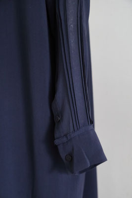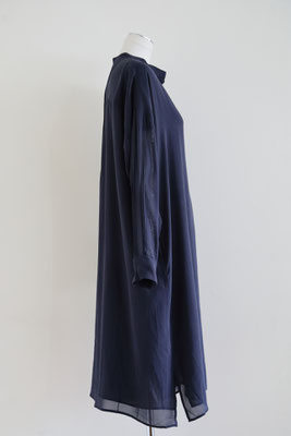 【 商品の特徴 】 とても薄くて柔らかなシルクジョーゼット・ストレッチ生地を贅沢にも二重にして作られたドレスです。袖だけが二重になっておらず、少し透け感がございます。背中心とアームホールにピントラックが付けられた立体感があるデザイン。深いネイビーの色合いです。
