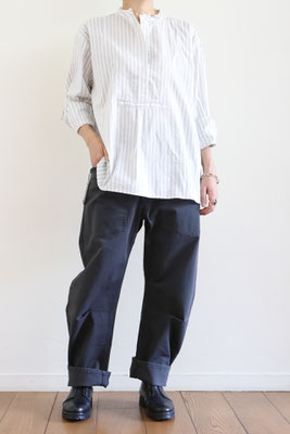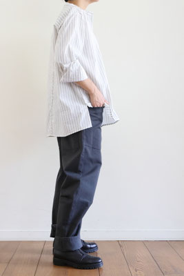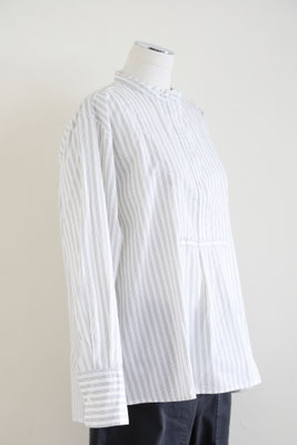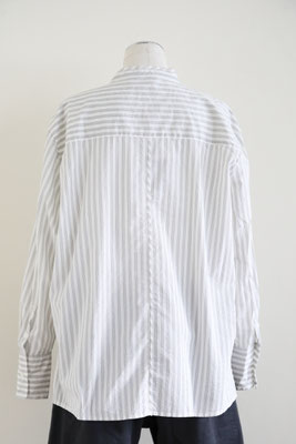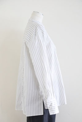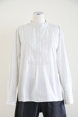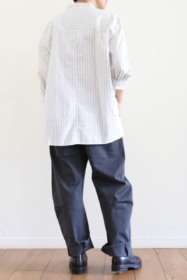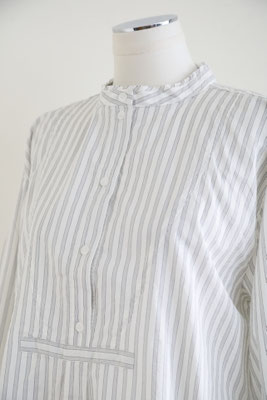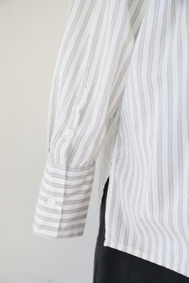【 商品の特徴 】 洗いをかけて少しシワ加工のようなナチュラルな風合いのコットン・シルク生地のシャツブラウスです。カジュアルなテイストですが、タキシードシャツのデザインに仕上げられています。小さなスタンド襟、たっぷりとした身幅、幅が広いカフスが特徴です。