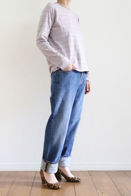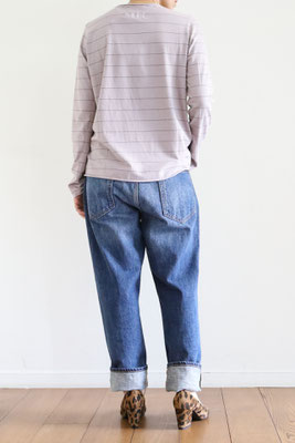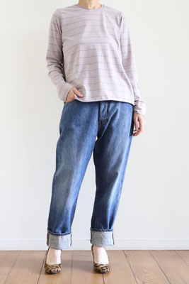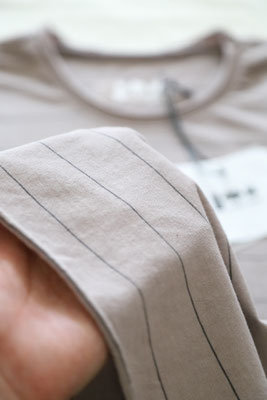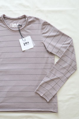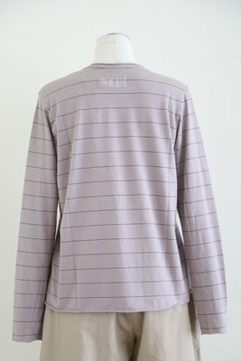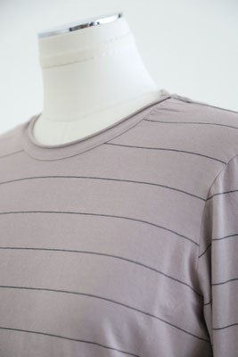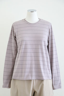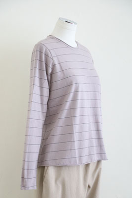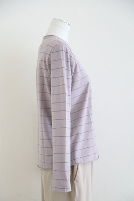 【 商品の特徴 】 コットンストレッチ生地でつくられた長袖Tシャツです。襟・袖口・スソは自然にカールするデザイン。ストレートシルエット。リラックスフィット。ライラックをベースにグレーの細いストライプ。ストレッチ感があり着心地抜群の仕上がりです。