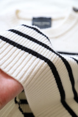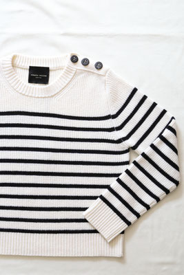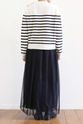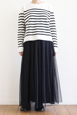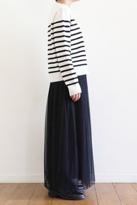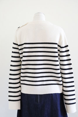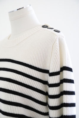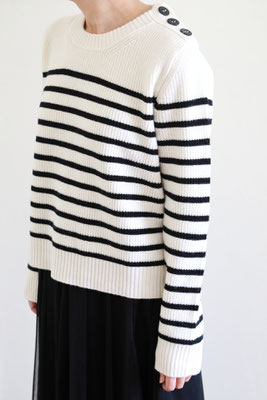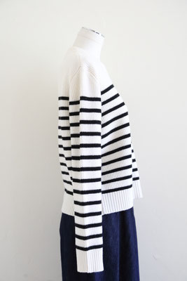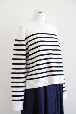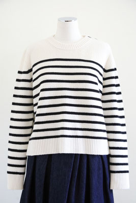 【 商品の特徴 】 イタリア製スーパーファインメリノを使って総リブ編みでつくられたセーターです。ホワイトをベースにブラックのボーダー柄。着丈は短めで身幅はたっぷりとしたボックスシルエット。左肩に大きなボタンが付けらています。リブは全体に緩めに編まれていて、軽くて柔らかい仕上がりです。