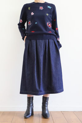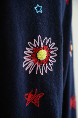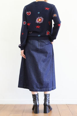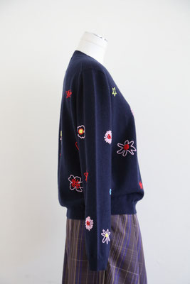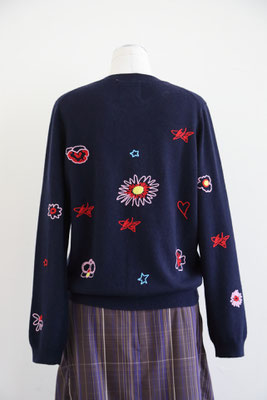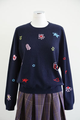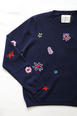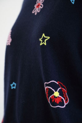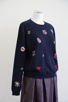 【 商品の特徴 】 深いネイビーの編地に、カラフルなフローラルモチーフの刺繍をちりばめたセーターです。刺繍は袖や背中側まで施されています。素材はカシミヤ 100%。ロンドンのスタジオでデザインされ、モンゴルで採取したカシミヤ原毛を、モンゴルのウランバートルで生産することにより、コストの削減とモンゴルの人々との仕事の協業を実現しています。