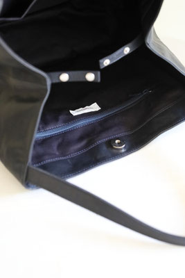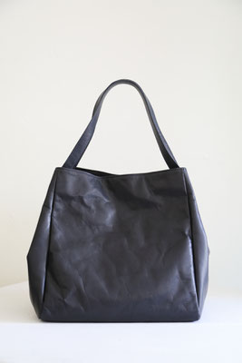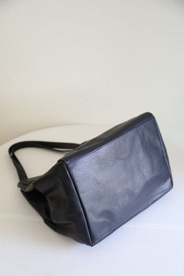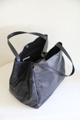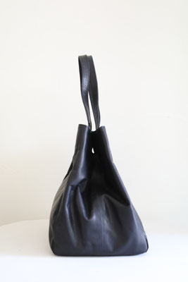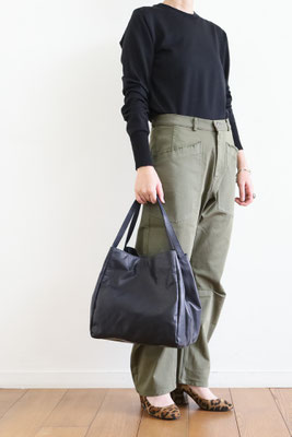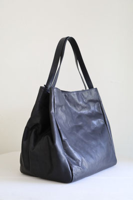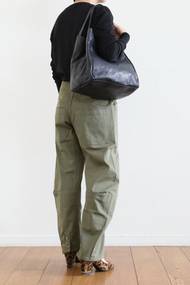 【 商品の特徴 】 染料のみで染色し、特殊加工を施すことによって表面がなめらかな、ヴィンテージライクな風合いのバッグです。高さ 28cm、底幅 29cm とほぼスクエアな正面に対する、19cm と広く柔らかく広がっていくマチが配してあります。そのため、開口部のスナップを外すと 47cm まで広がる大開口になり、夏の一泊旅行程度まで対応出来そうな収納量になります。大きさに対して、とても軽い仕上がりなのもうれしいポイントです。